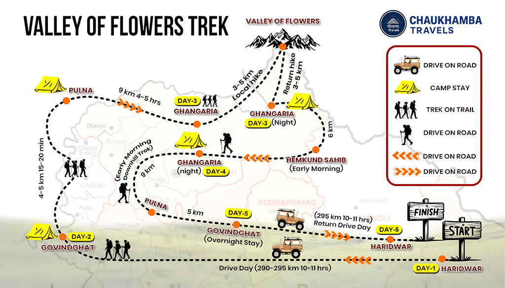 This route map shows the complete trail from Govindghat to Ghangaria and the Valley of Flowers. It also includes the Hemkund Sahib day visit.